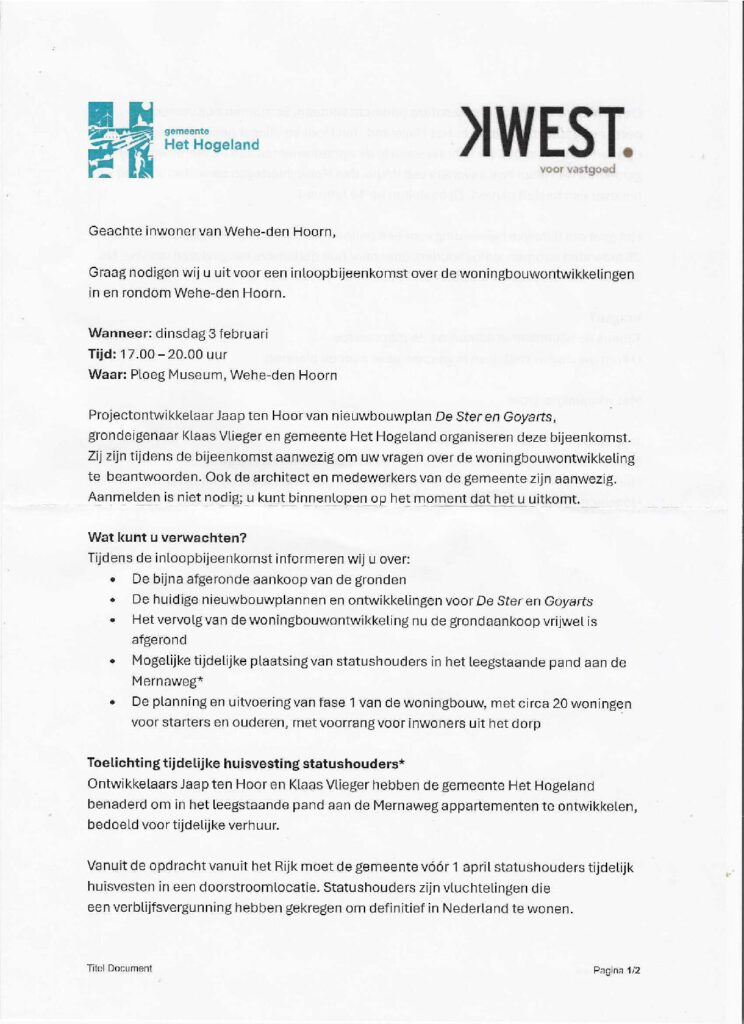 Tekeningen beschikbaar maar geen toelichting van de gemeente. Wordt zeker niet centraal besproken. Geeft reuring in het dorp.